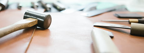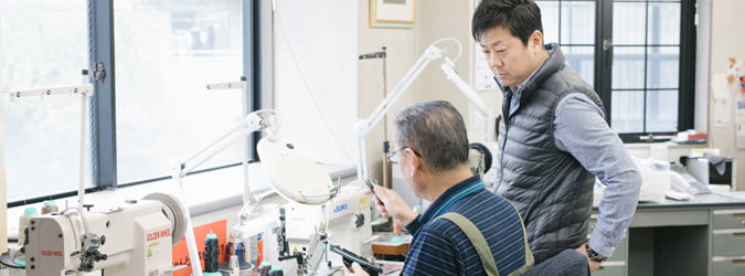 アスメデル イタクラの財布作りに対する心構え。ベテラン職人の原口とその後を継ぐ菅谷の仕事ぶりとともに紹介しています。